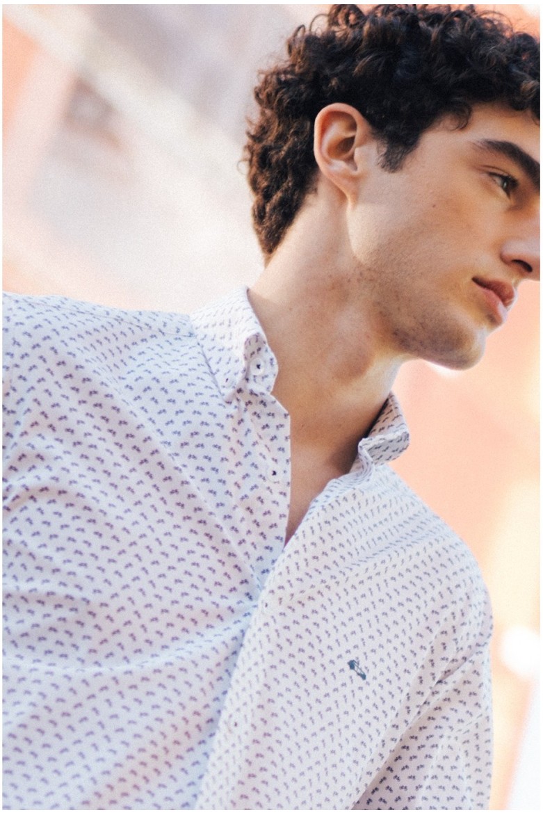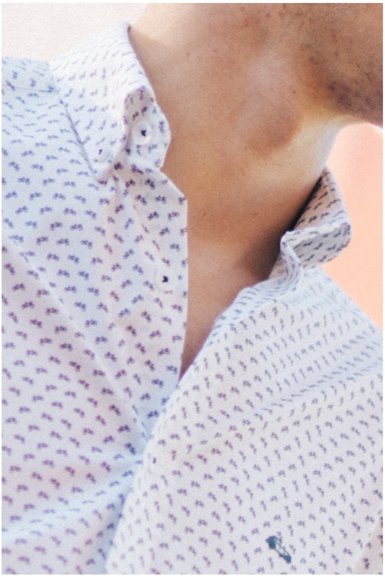 Camisa de hombre regular fit en color azul con estampado microdibujo, manga larga y cuello con botones, confeccionada en tejido técnico elástico que aporta comodidad, transpirabilidad y libertad de movimiento. Hecha en España.