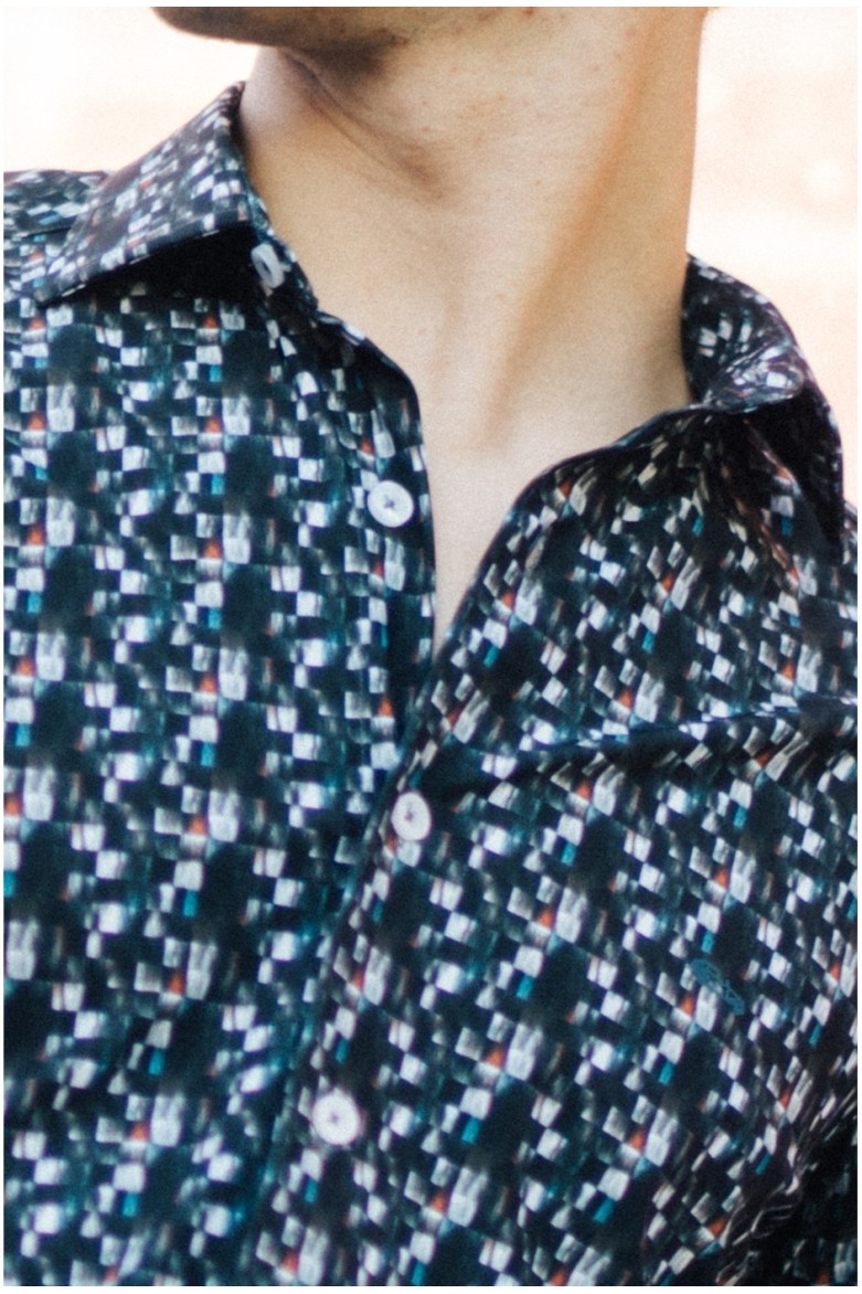 Camisa de hombre regular fit con cuello italiano y manga larga. Presenta un original estampado multicolor sobre tejido elástico que proporciona confort y libertad de movimiento. Fabricada en España bajo procesos responsables y sostenibles.