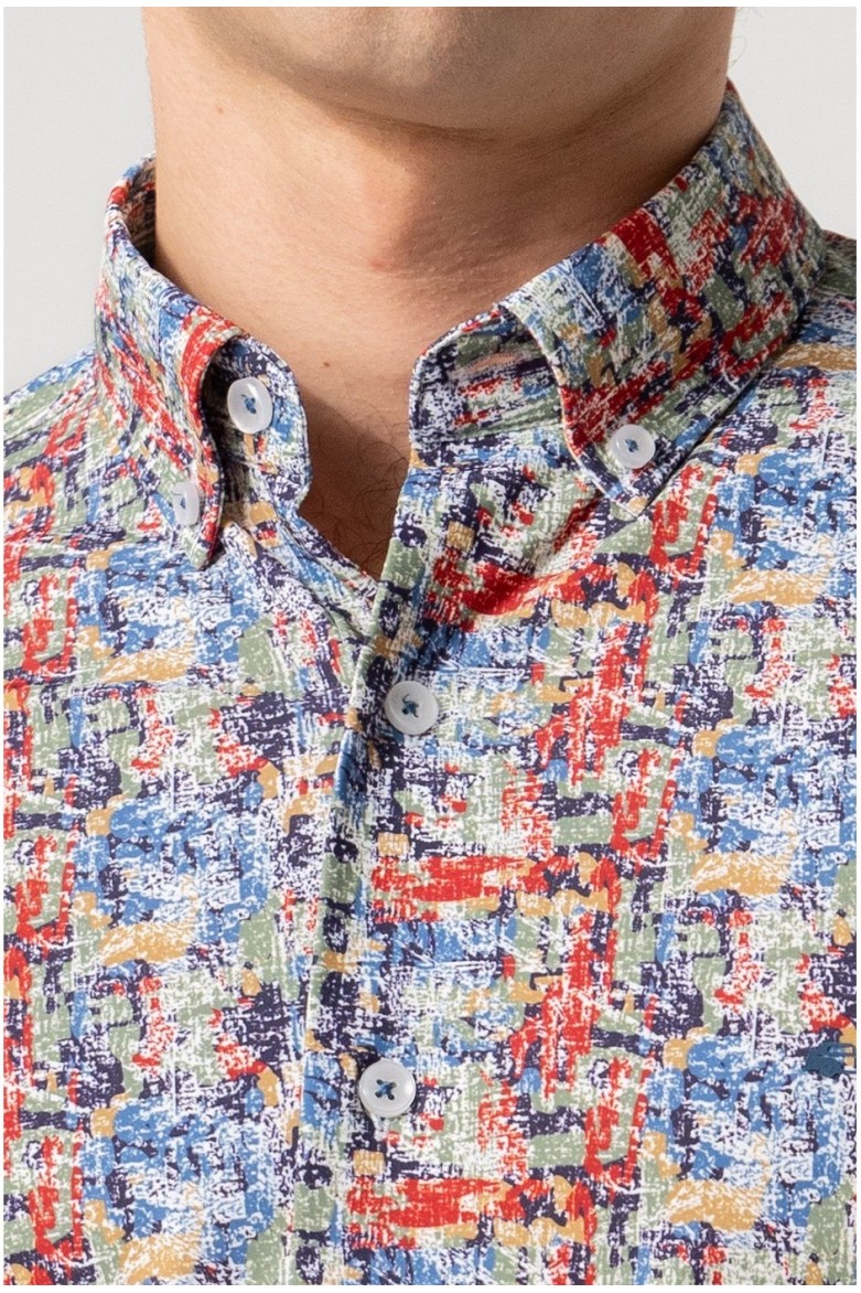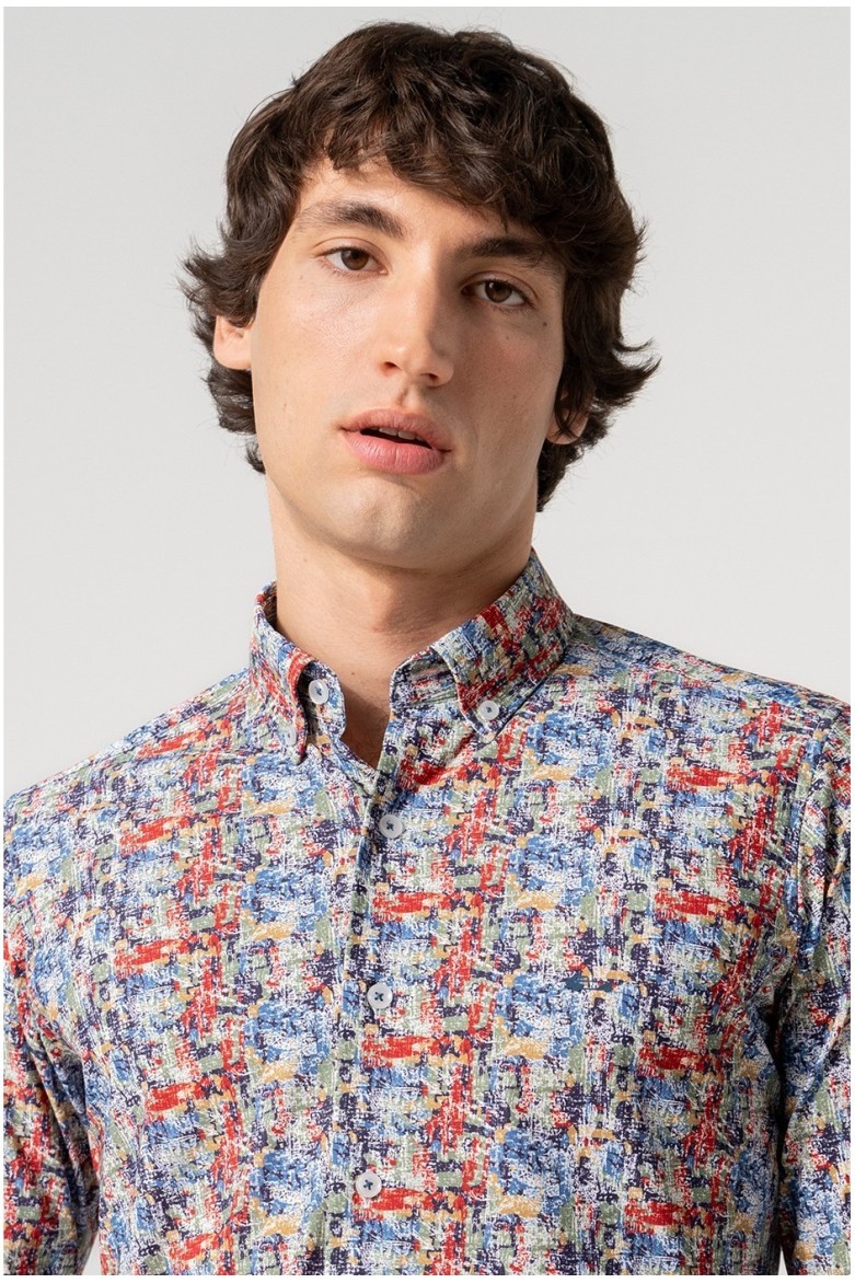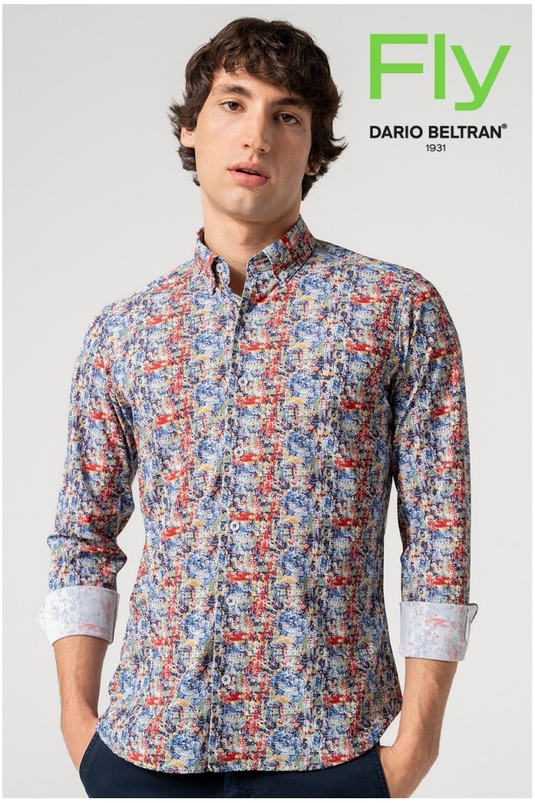 Camisa de hombre regular fit con cuello abotonado y manga larga. Destaca por su llamativo estampado multicolor sobre tejido elástico que aporta comodidad y libertad de movimiento. Confeccionada en España siguiendo procesos responsables y sostenibles.