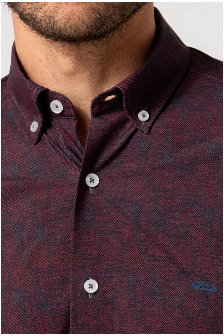 Camisa de hombre regular fit en color granate con estampado sutil. Presenta cuello abotonado y manga larga, confeccionada en tejido elástico que aporta confort y libertad de movimiento. Una prenda fabricada en España con procesos responsables.