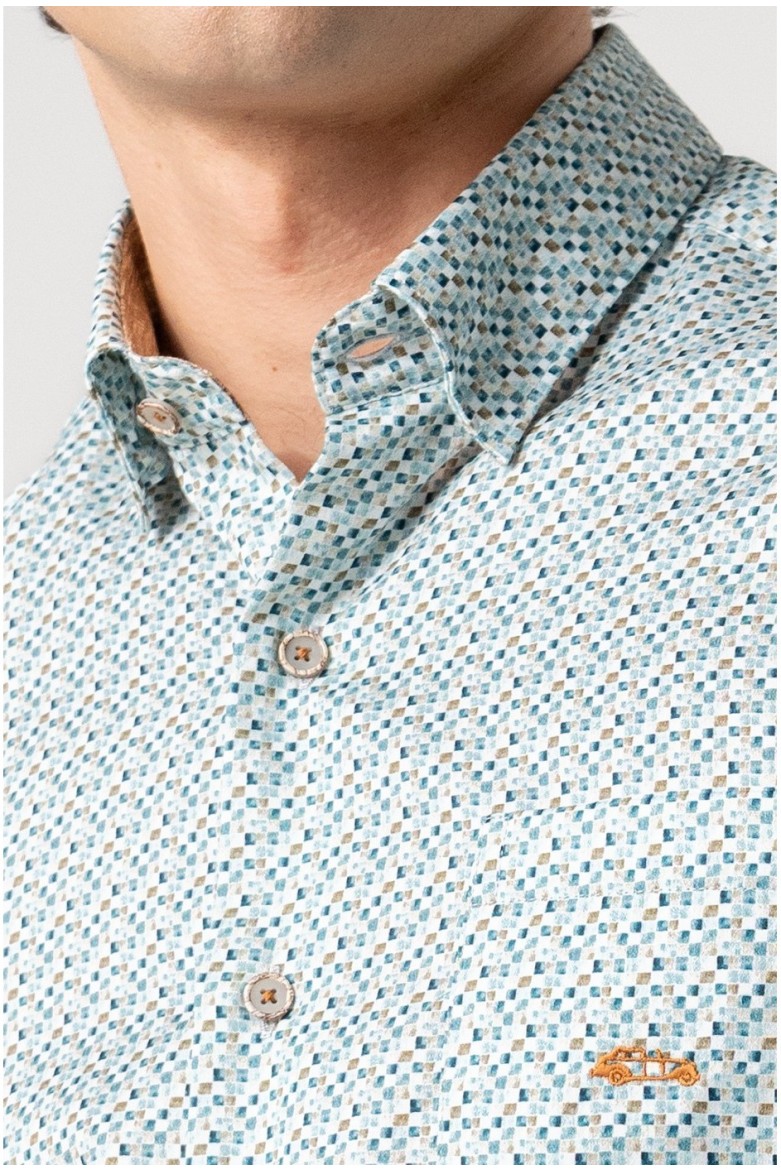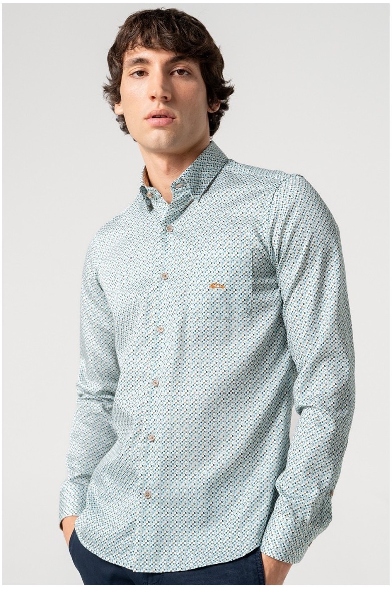 Camisa de hombre de corte regular fit en tejido 100% algodón, con manga larga y cuello de botones ocultos, presentada en un estampado multicolor de estilo geométrico que aporta frescura y personalidad al look. Confeccionada en España.