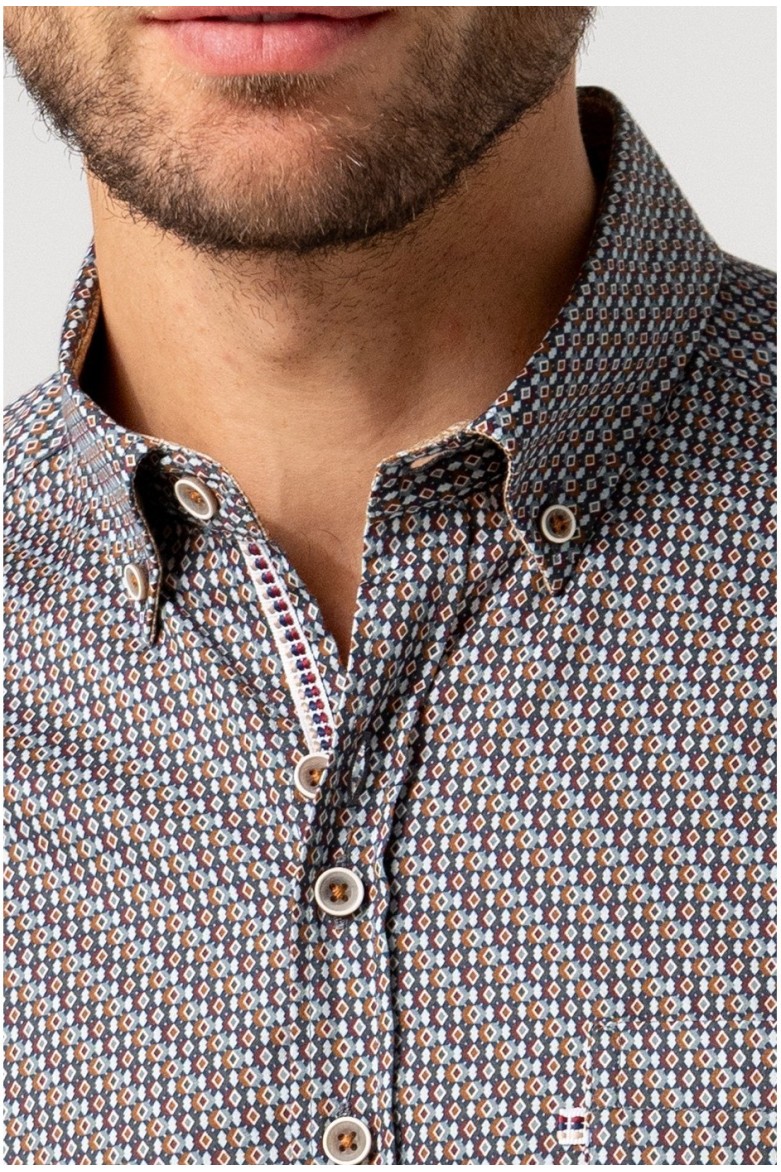 Camisa regular fit de hombre confeccionada en 100% algodón. De manga larga y cuello de botón, destaca por su estampado multicolor en microdibujo geométrico que aporta un aire moderno y distintivo. Una prenda versátil y cómoda, ideal para elevar looks casuales o completar estilos más cuidados.