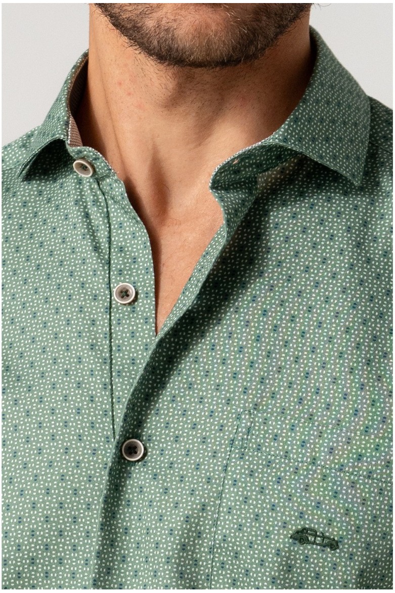 Camisa regular fit de hombre confeccionada en 100% algodón. De manga larga y cuello italiano blando, presenta un estampado geométrico en color verde que aporta frescura y un estilo actual. Una prenda ligera y versátil, ideal para looks casuales con un punto de distinción.