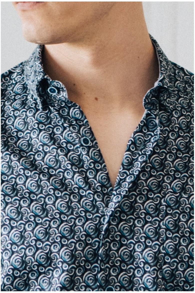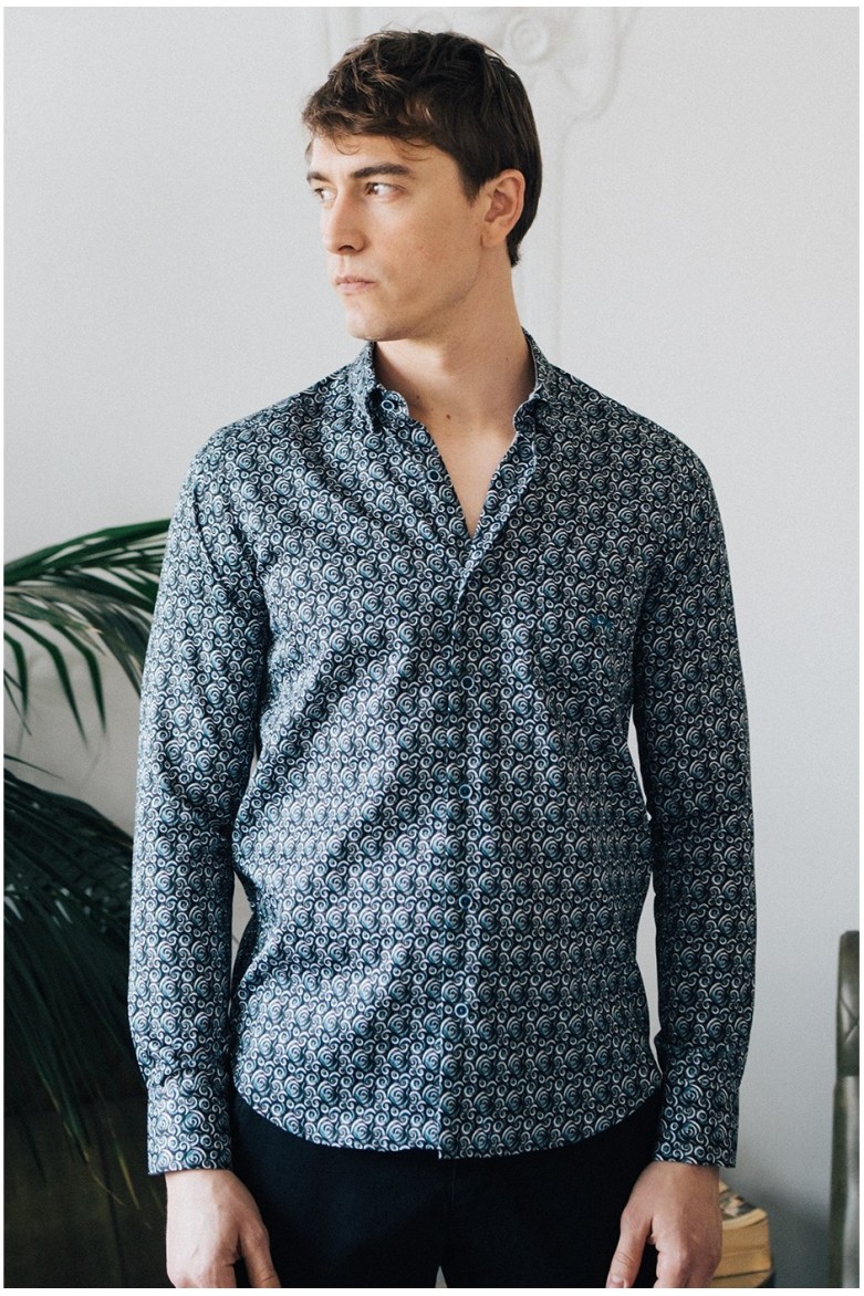 Camisa regular fit de hombre confeccionada en algodón 100%. De manga larga y cuello con botón oculto, presenta un estampado en tonos azules que aporta frescura y un aire distintivo. Una prenda cómoda y versátil, perfecta para combinar en looks casuales con un punto de originalidad.