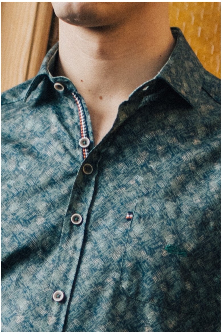Camisa slim fit de hombre confeccionada en algodón 100%. De manga larga y cuello italiano blando, destaca por su estampado en tonos verdes que aporta un aire moderno y elegante. Una prenda ligera y versátil, perfecta para completar looks de estilo actual tanto en ocasiones formales como casuales.