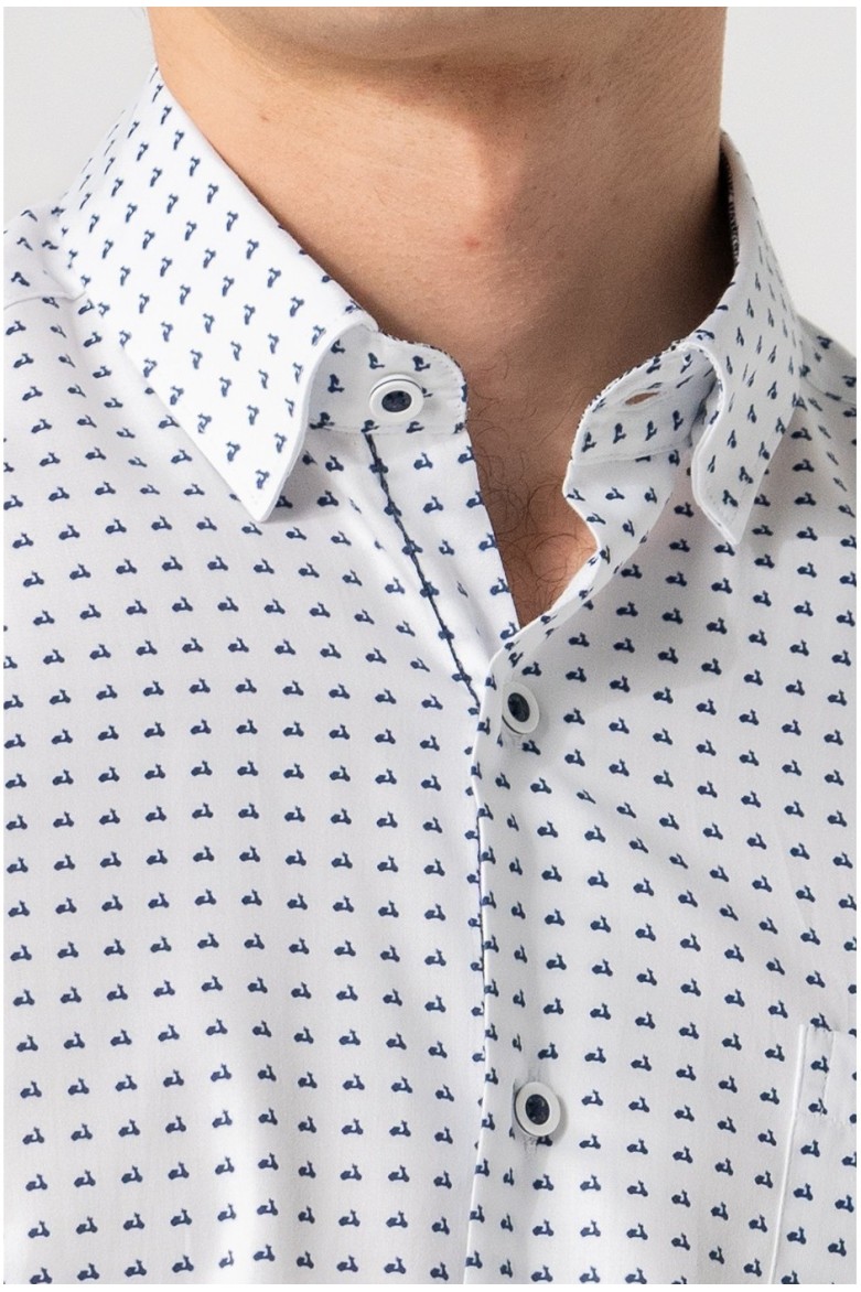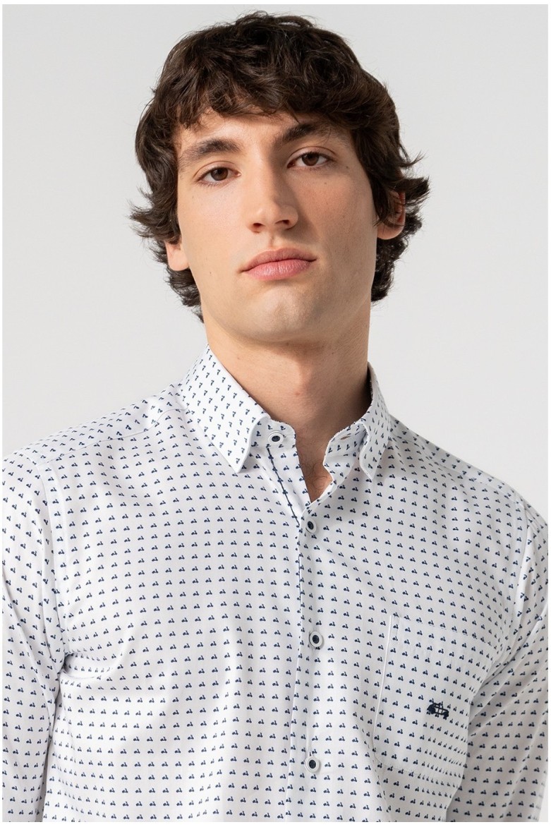 Camisa regular fit de hombre en 100% algodón. Con manga larga y cuello de botón oculto, luce un estampado geométrico en tono azul sobre fondo claro, que aporta frescura y un aire actual. Una prenda versátil, ideal para combinar en ocasiones tanto informales como de estilo más cuidado.