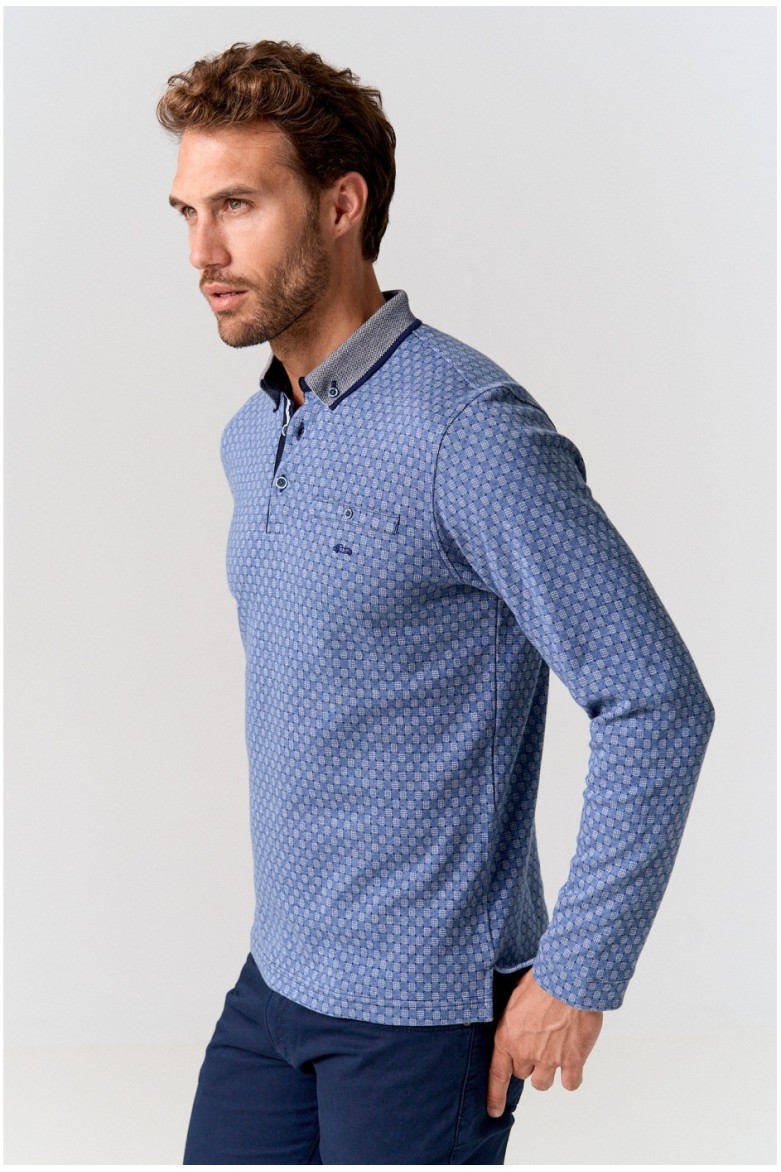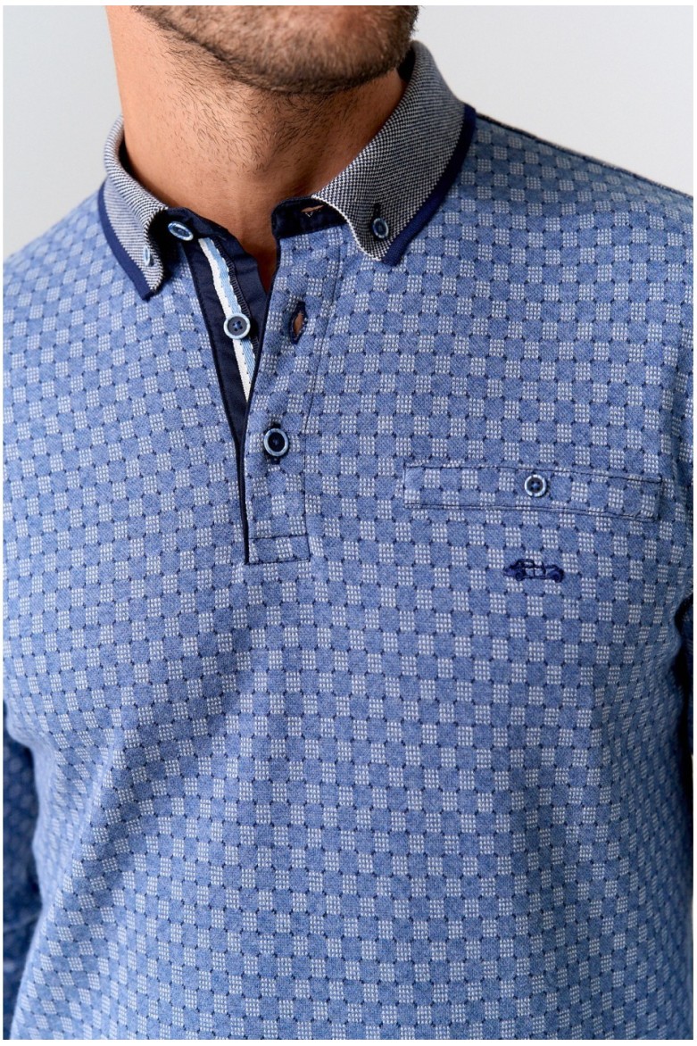 Polo estampado cuadrados azules slim fit con cuello a contraste con botones y confeccionado en algodón extrasuave. Con falso bolsillo y coche bordado en pecho.