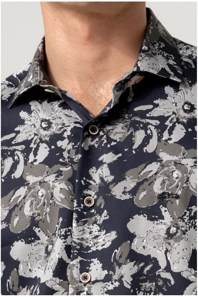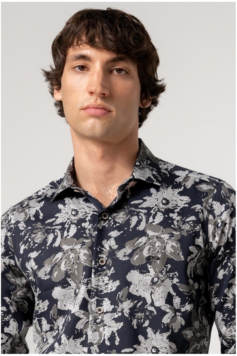 Camisa slim fit de hombre confeccionada en 100% algodón. De manga larga y cuello italiano blando, luce un estampado multicolor de inspiración floral que aporta personalidad y frescura al look. Una prenda ligera y actual, perfecta para destacar en ocasiones informales. Hecha en España con dedicación y calidad.