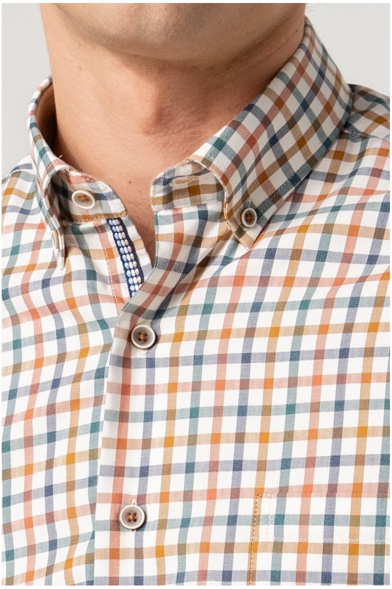 Camisa regular fit de hombre confeccionada en una mezcla de algodón y poliéster (60%-40%). De manga larga y cuello con botón, luce un diseño de cuadros multicolor que aporta dinamismo y frescura. Una prenda práctica y versátil, ideal para el día a día. Diseñada en España con especial atención al detalle.