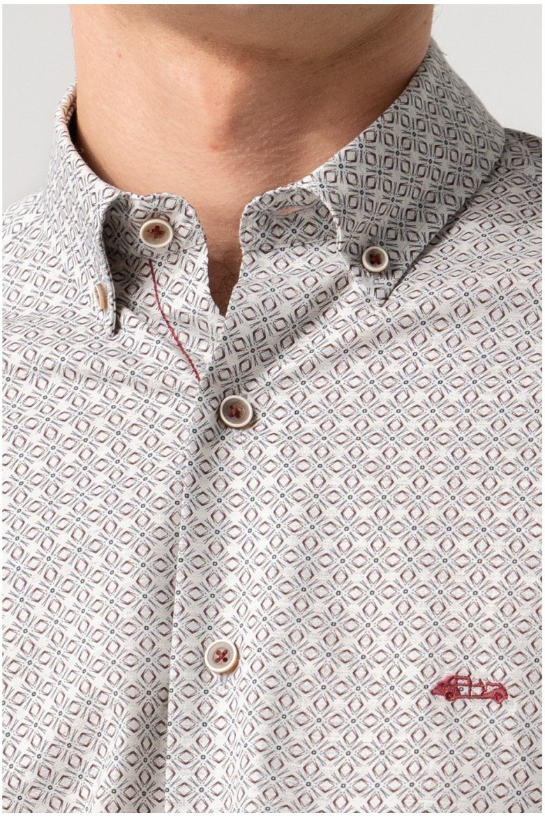 Camisa regular fit de hombre confeccionada en una mezcla de 70% algodón y 30% poliéster. De manga larga y cuello con botón, presenta un estampado geométrico multicolor que aporta modernidad y personalidad al look. Una prenda versátil y ligera, ideal para combinar tanto en estilismos informales como en conjuntos más cuidados. Fabricada en España con materiales de calidad y gran atención al detalle.
