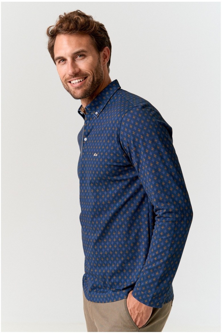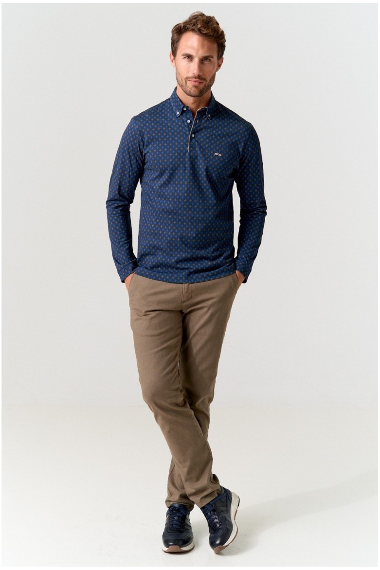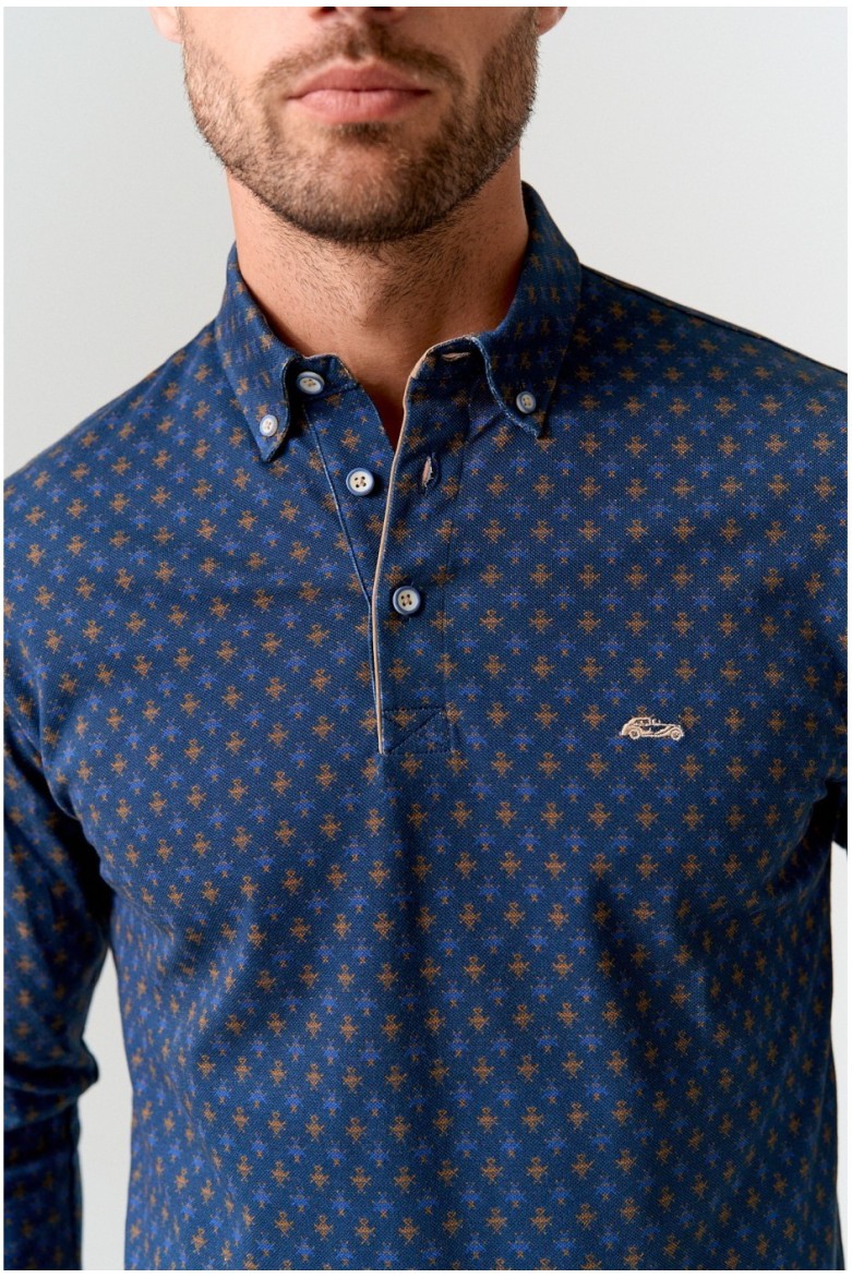 Polo piqué estampado marino slim fit con cuello con botones y confeccionado en algodón extrasuave. Coche bordado al contraste en pecho.
