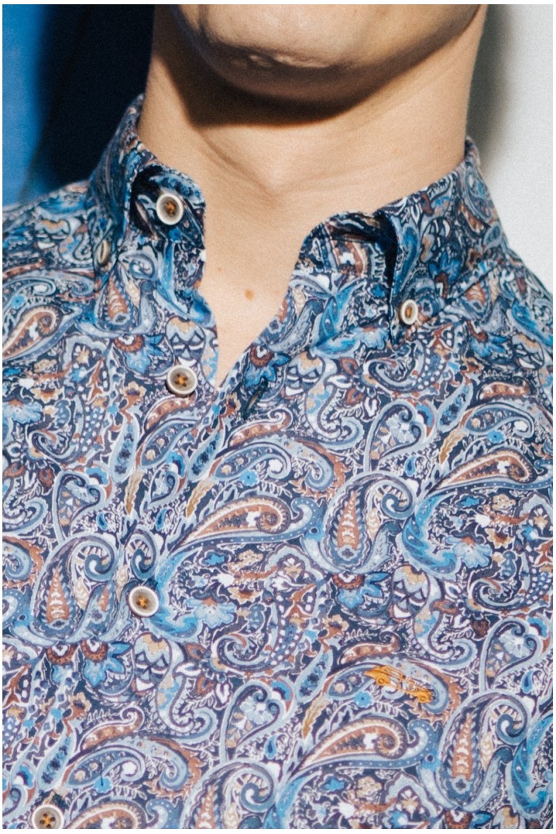 Camisa slim fit de hombre confeccionada en 100% algodón. De manga larga y cuello con botón, luce un estampado paisley en tonos multicolor que aporta un aire sofisticado y moderno. Una prenda ligera y cómoda, ideal para destacar en ocasiones especiales o en looks casuales con personalidad. Diseñada en España con especial atención al detalle.