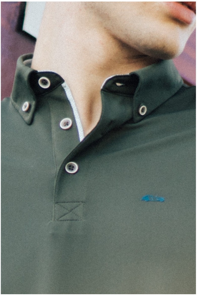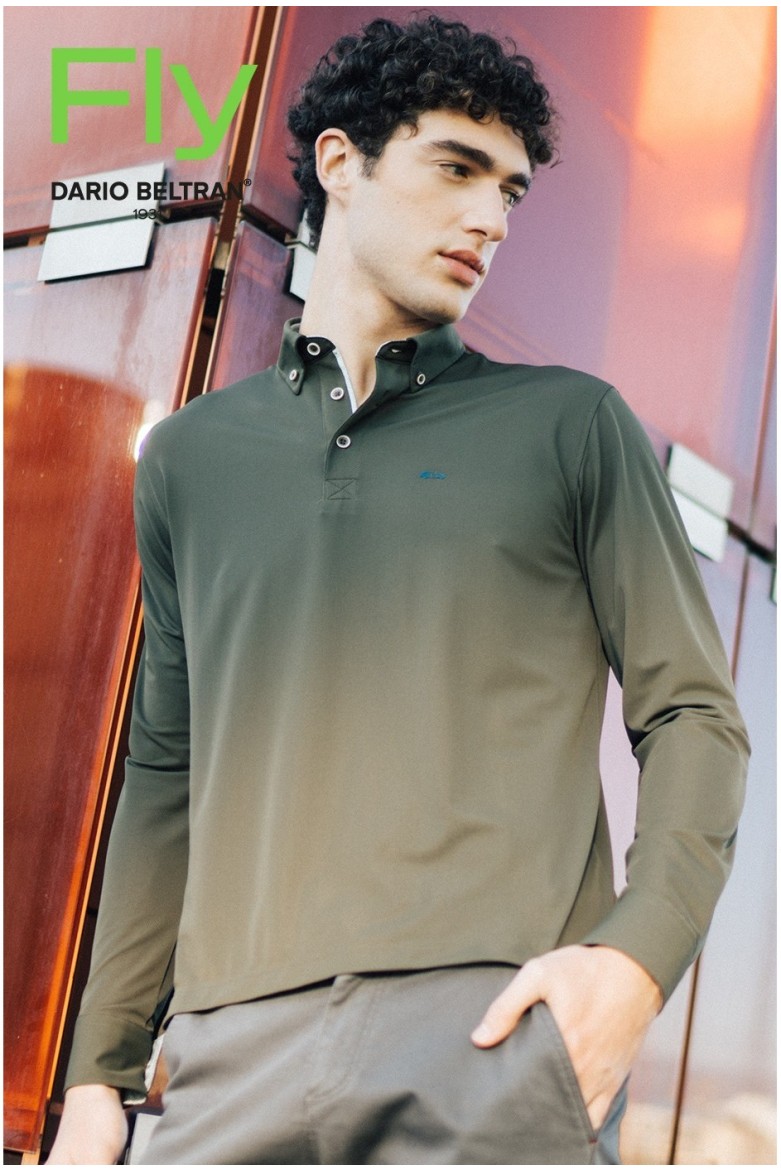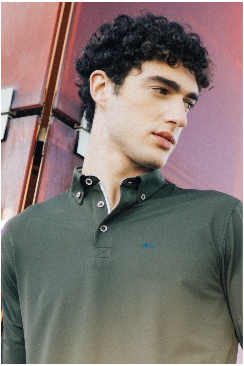 Polo de hombre de manga larga con cuello camisero, confeccionado en tejido elástico de poliamida y elastano que asegura comodidad y libertad de movimiento. Acabado en color verde, es una prenda versátil y actual, perfecta para un estilo casual distinguido.