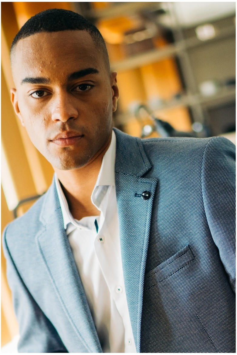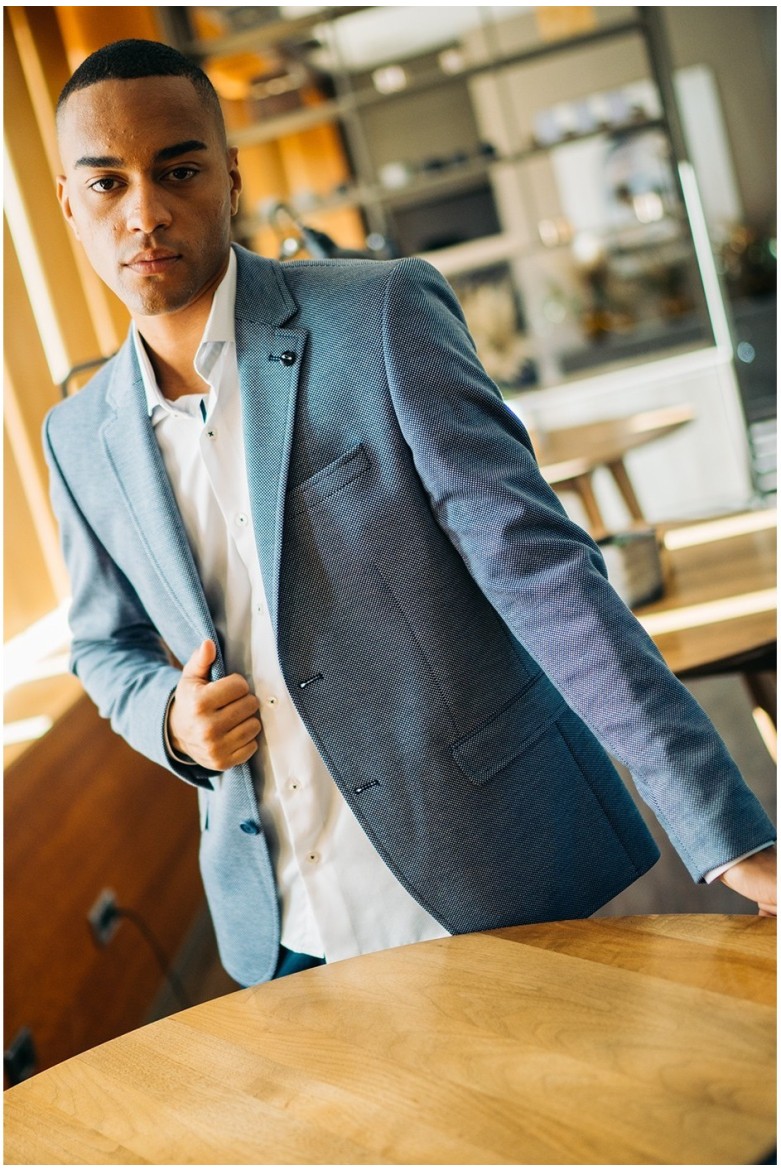 Americana azul confeccionada en estructura de punto. Cuello con solapa de muesca y ojal. Abertura frontal con dos botones. Bolsillo en pecho y dos bolsillos de plastrón en el bajo. Dos aberturas en la espalda.
