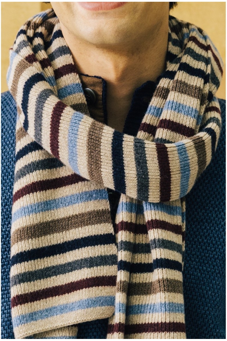 Suave bufanda de punto color beige con rayas multicolor confeccionada en mezcla de lana. Tamaño 30 x 180 cm.
