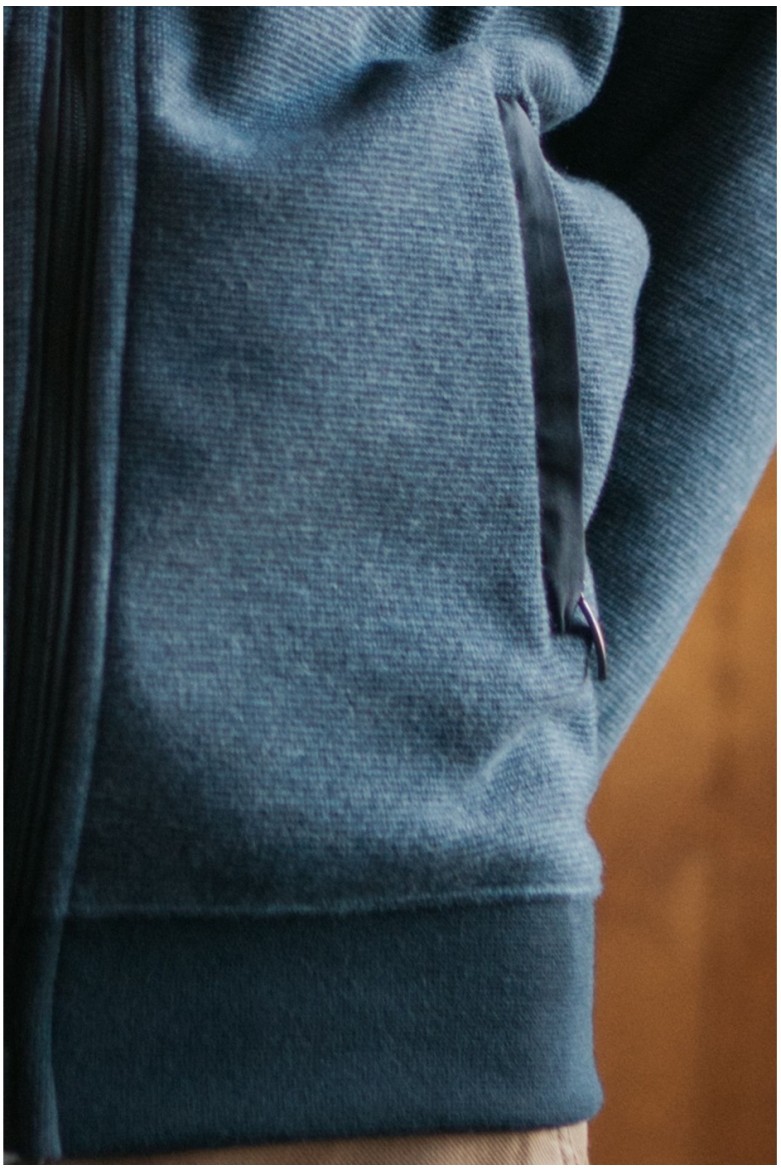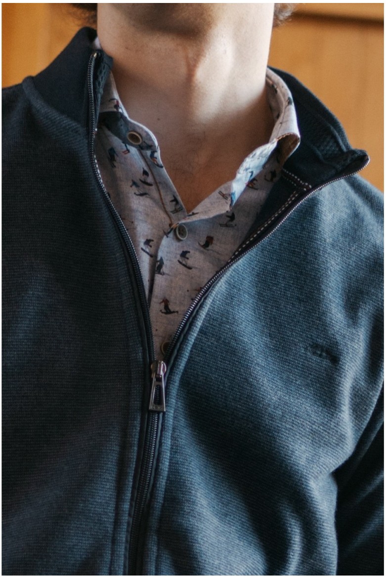Chaqueta de estructura perchada de punto circular color marino con cremallera y bolsillos frontales y detalle de cinta al tono. Coche resaltado en el frontal. Acabados en rib en bajo y puños.