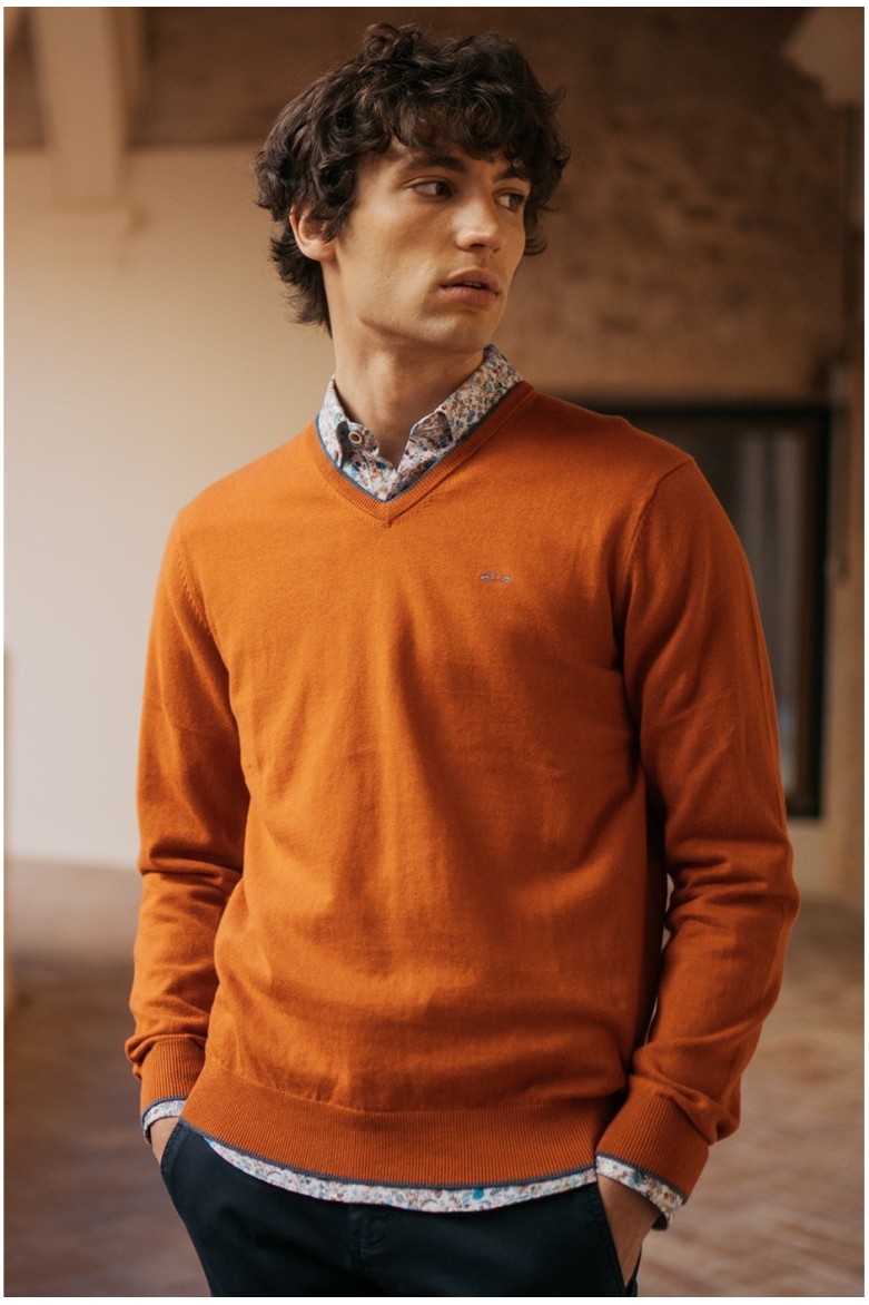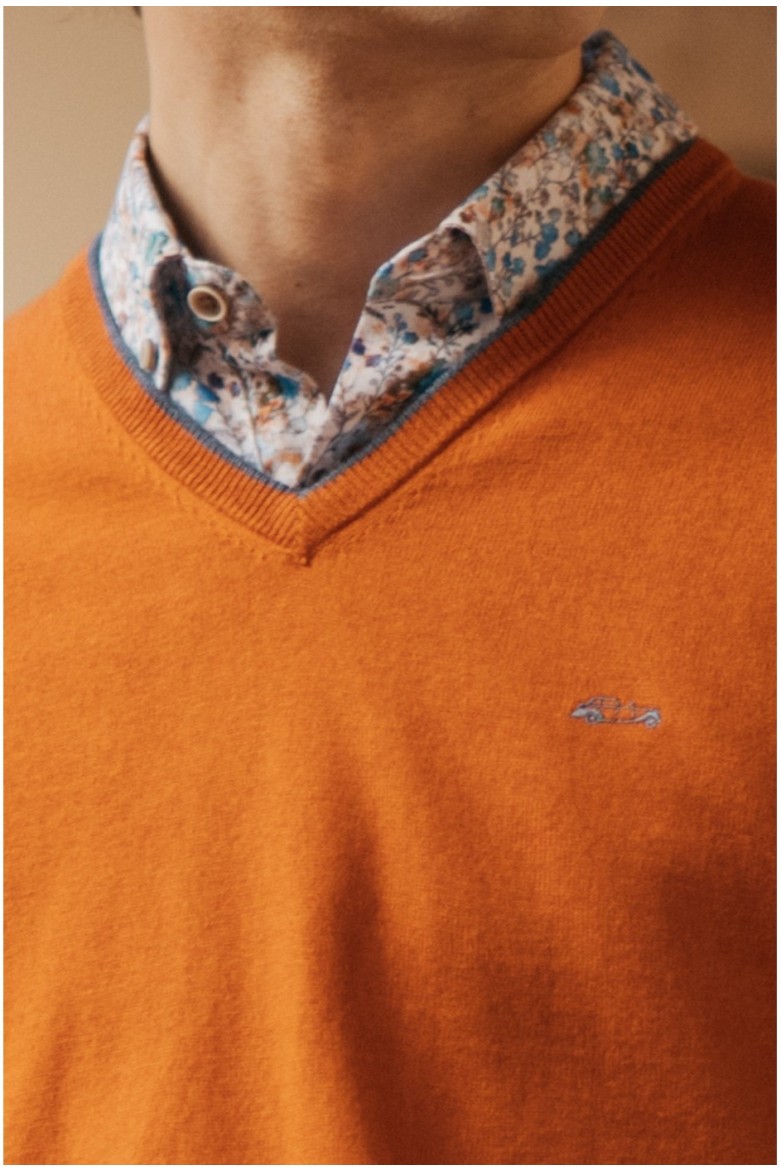 Jersey cashmere de punto liso de algodón color naranja. Cuello pico y coche bordado al contraste en el frontal. Acabados en rib.
