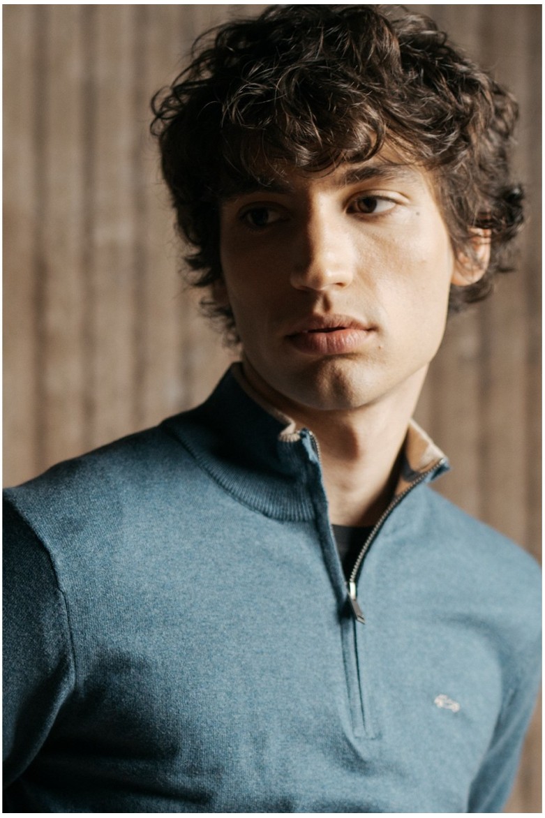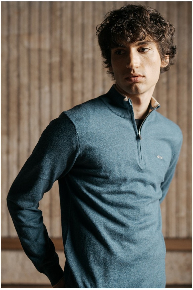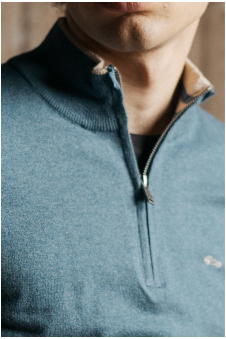 Jersey cashmere de punto liso de algodón en color azul. Cuello semicisne con cremallera y coche bordado al contraste en el frontal. Acabados en rib.