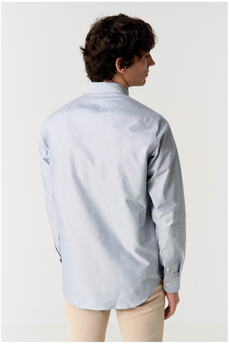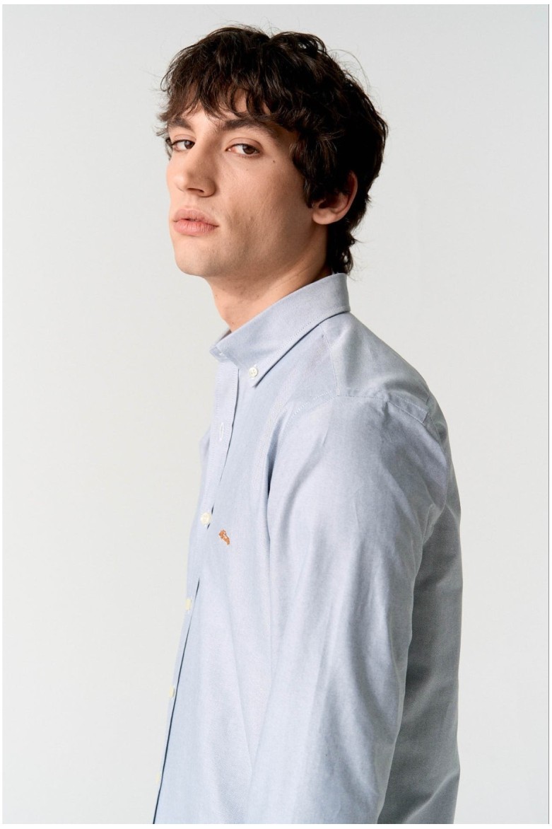 Camisa regular fit de manga larga acabada en puño con botones, confeccionada en tejido Oxford 100% algodón. Con cuello abotonado y cierre central mediante botonadura. Coche bordado a contraste en el delantero izquierdo. Hecha en España.