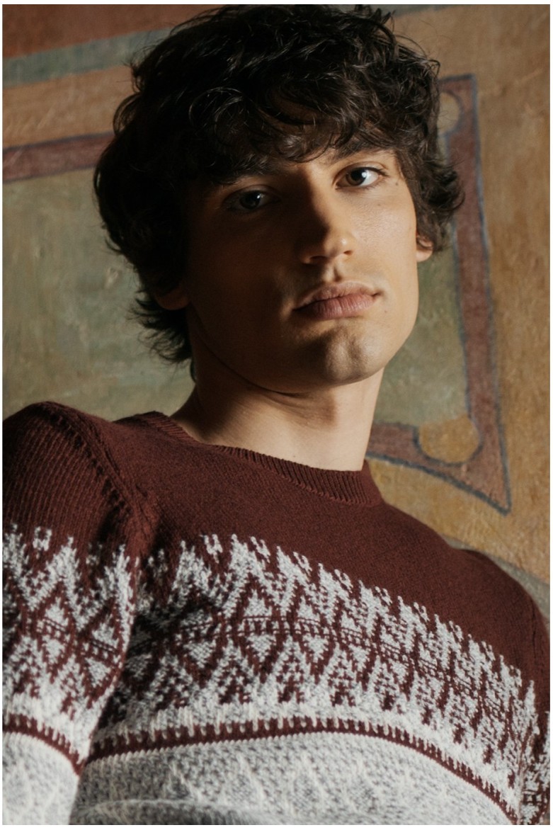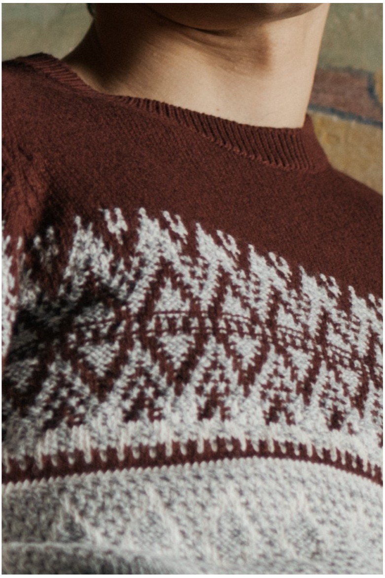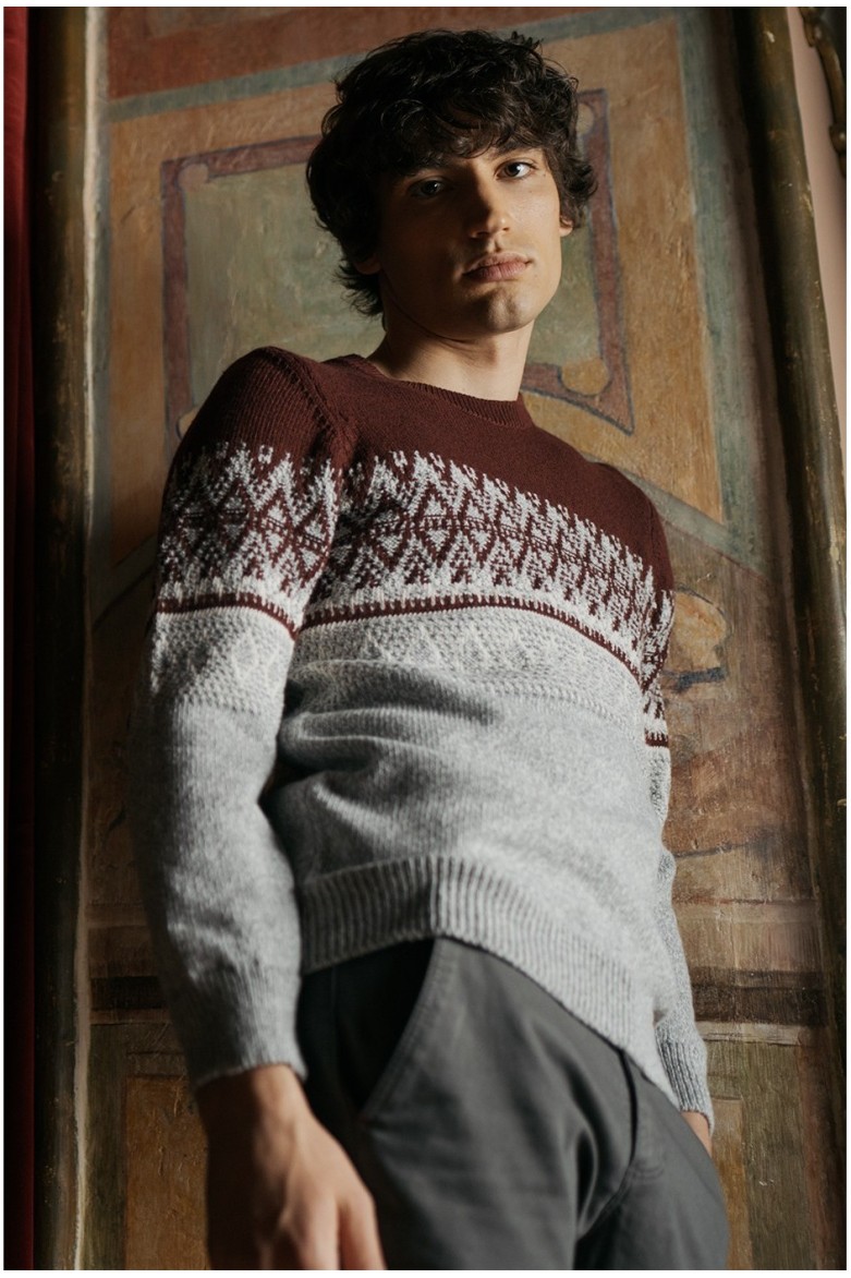 Jersey de punto con cenefas color gris y granate con cuello redondo confeccionado con mezcla de algodón. Puños y bajos acanalados.