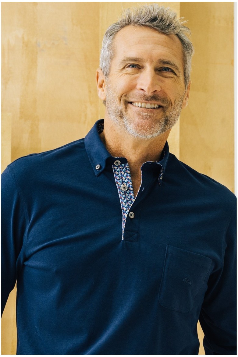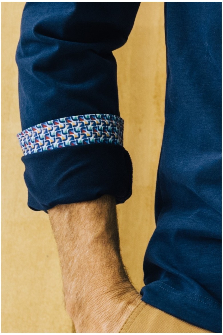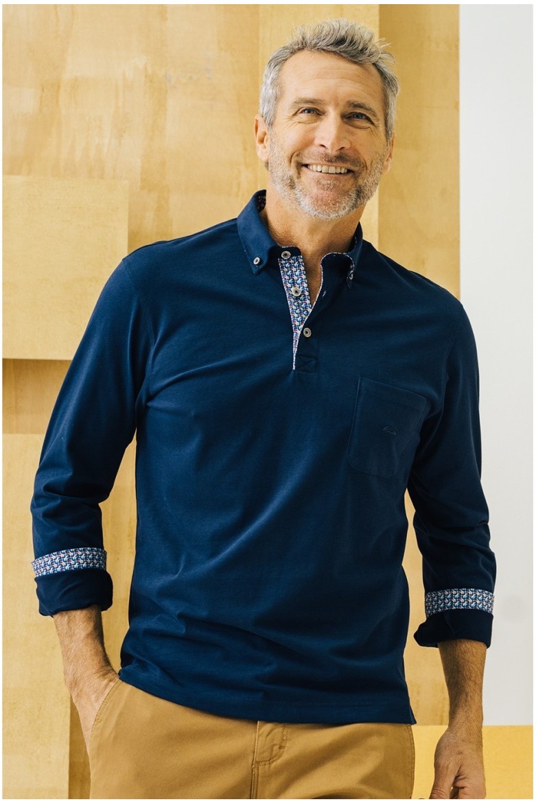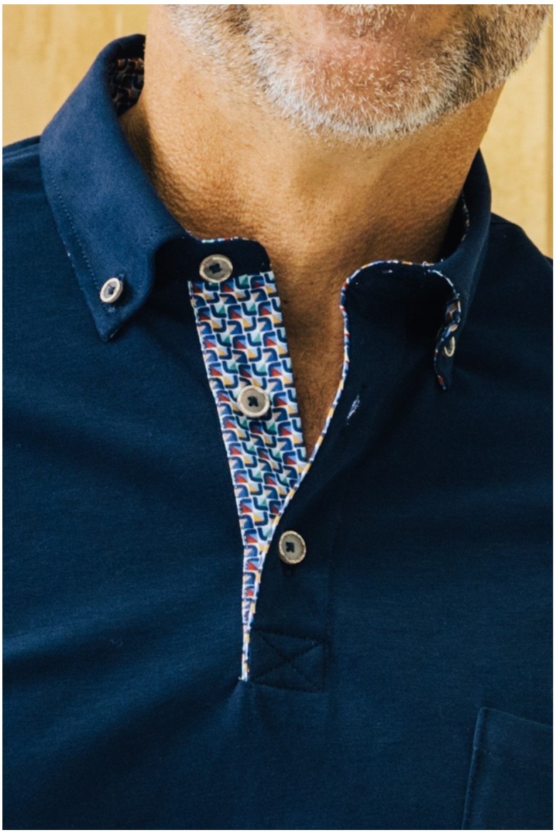 Polo punto liso perchado marino confeccionado en 100% algodón con cuello camisero. Bolsillo de parche con bordado de coche resaltado al tono en el frontal. Combinado en manga y cuello estampado geométrico. Aberturas laterales en el bajo.