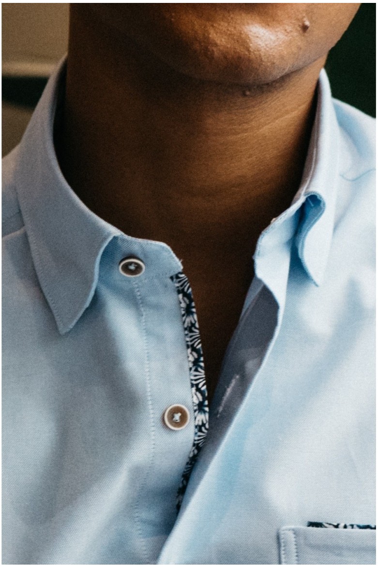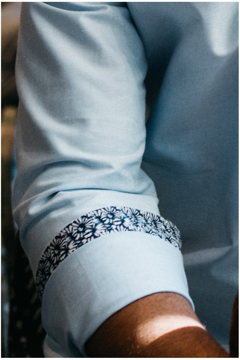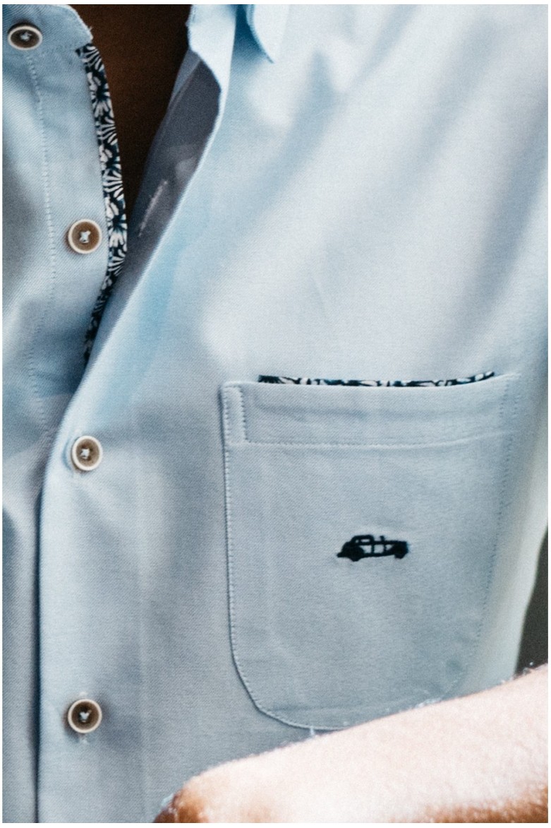 Camisa regular fit de manga larga en tejido oxford azul celeste. Cuello con botón oculto. Mangas largas cerradas con botón. Interior de los puños coordinados con motivos florales a juego con el adorno de la botonadura y el bolsillo.