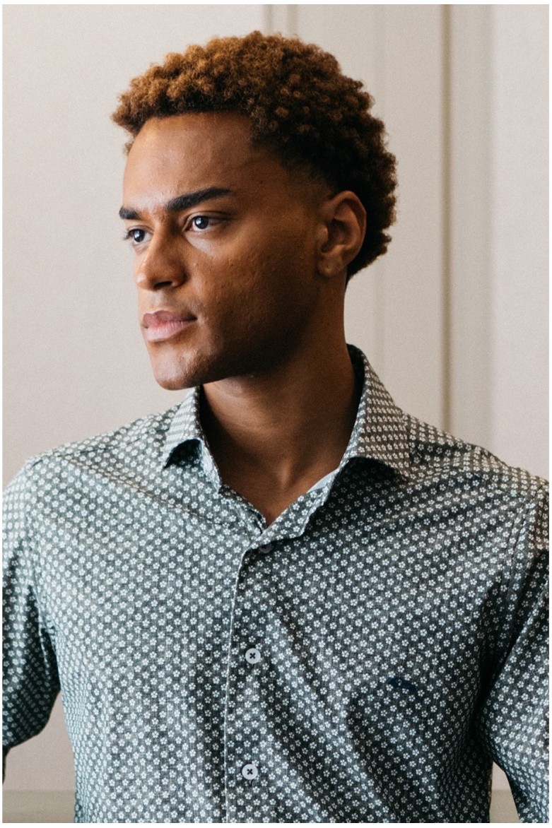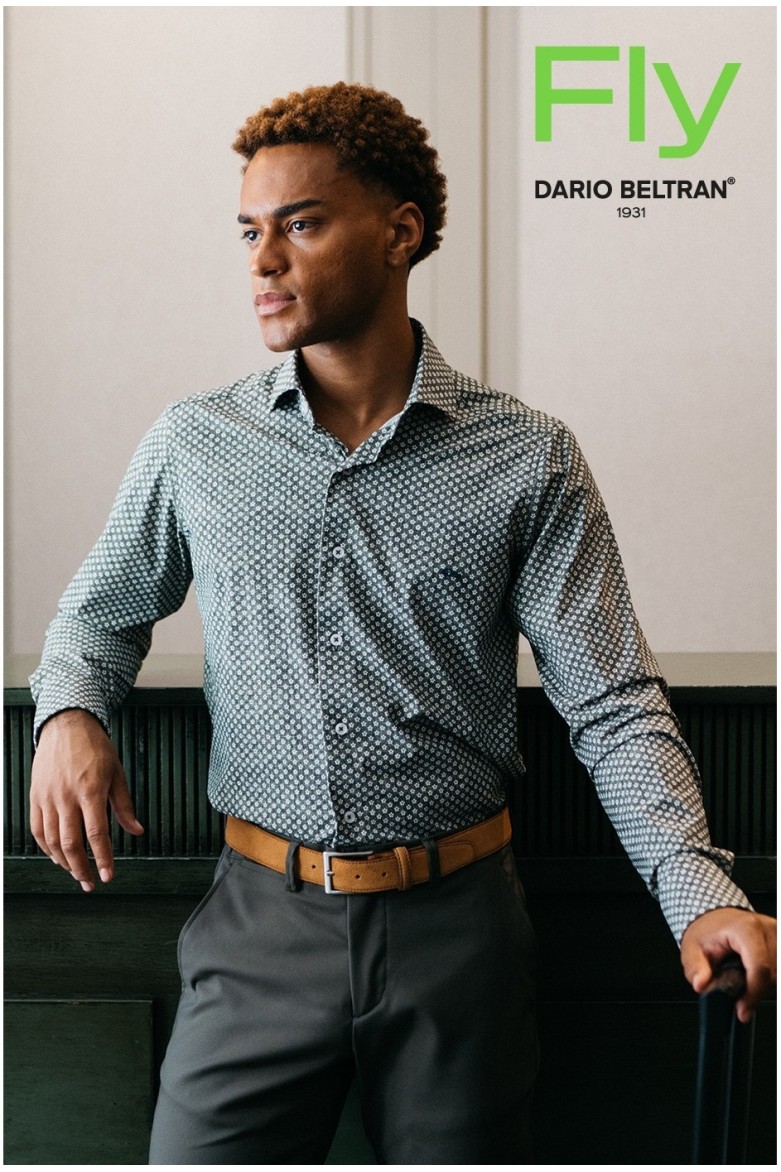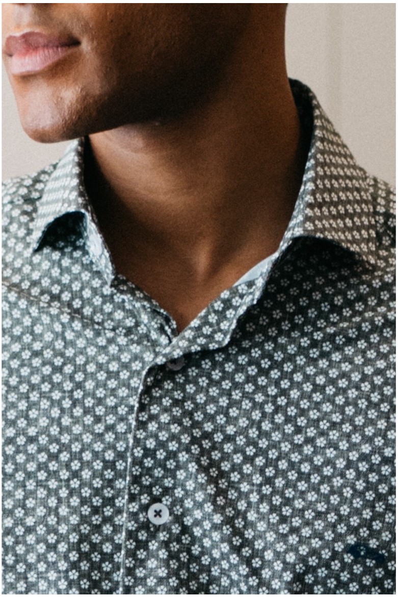 Camisa regular fit con cuello italiano abierto con estampado de flores en color verde. El tejido es bielástico y no necesita plancha, sólo lavar y colgar para secar. Tratamiento antibacteriano que previene olores. Logo adhesivo aplicado en el pecho.