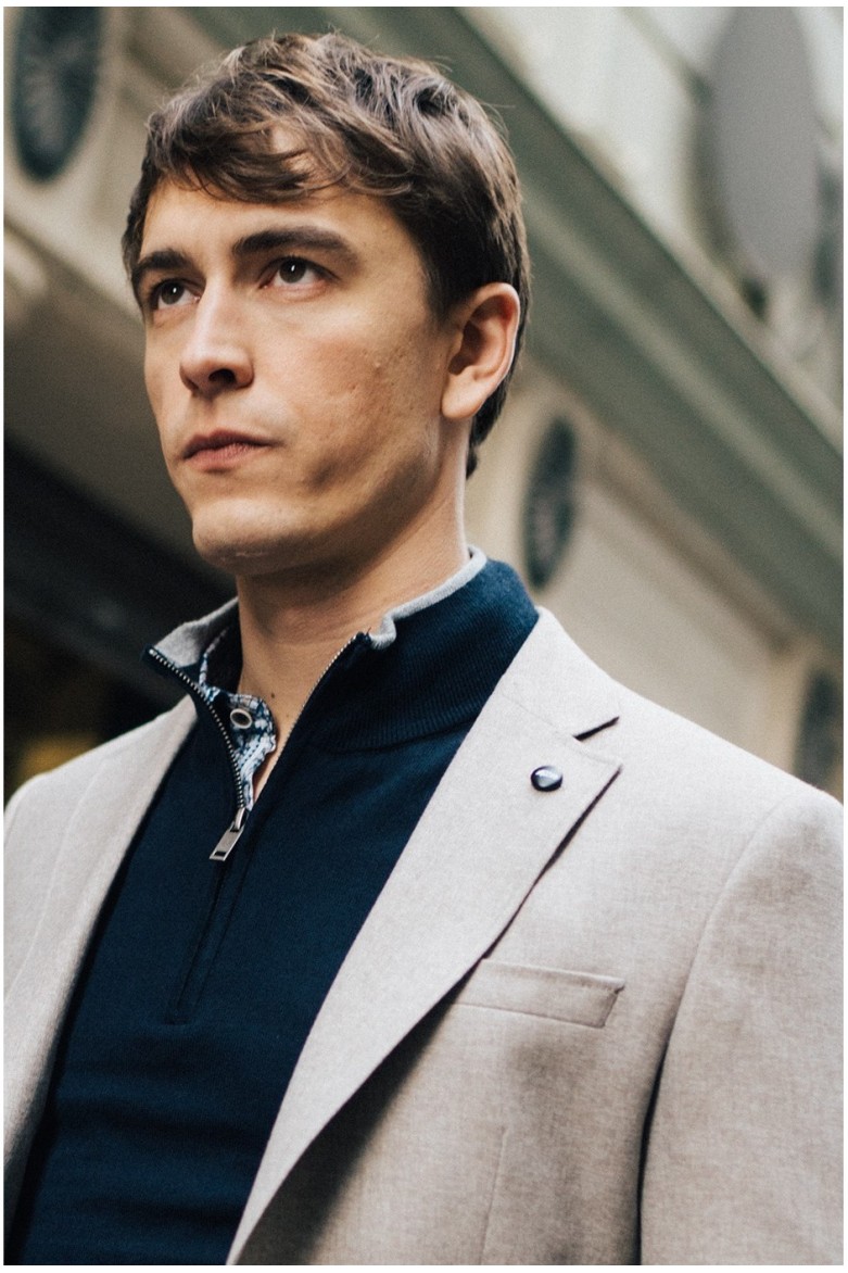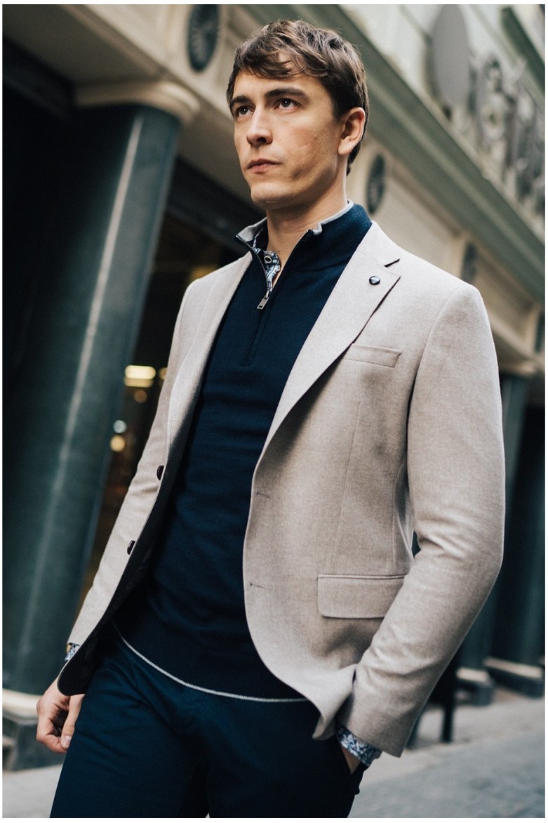 Americana de hombre en color gris claro, confeccionada en un tejido mixto con poliéster, viscosa y elastano que aporta estructura, elasticidad y comodidad, con diseño de solapa clásica, cierre de dos botones y bolsillos de vivo con solapa. Confeccionada en España.