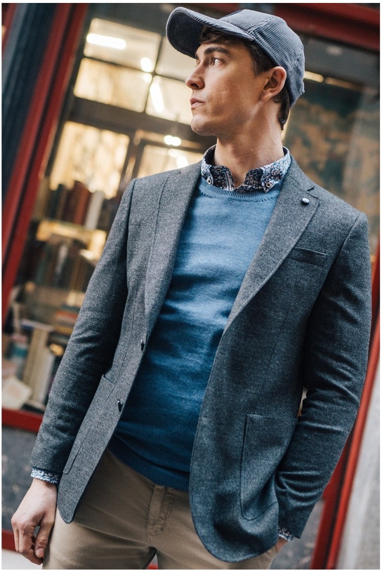 Americana de hombre en color marino, confeccionada en mezcla de poliéster, viscosa y elastano que proporciona estructura, elasticidad y comodidad, con solapa clásica, cierre de dos botones y bolsillos de parche. Confeccionada en España de manera sostenible.