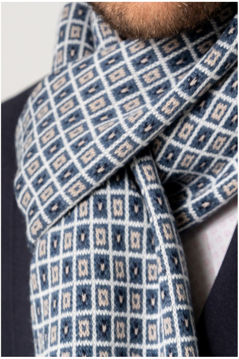 Bufanda de hombre en color azul con diseño de cuadros geométricos, confeccionada en tejido acrílico de tacto suave que aporta calidez y confort. Fabricada en España.