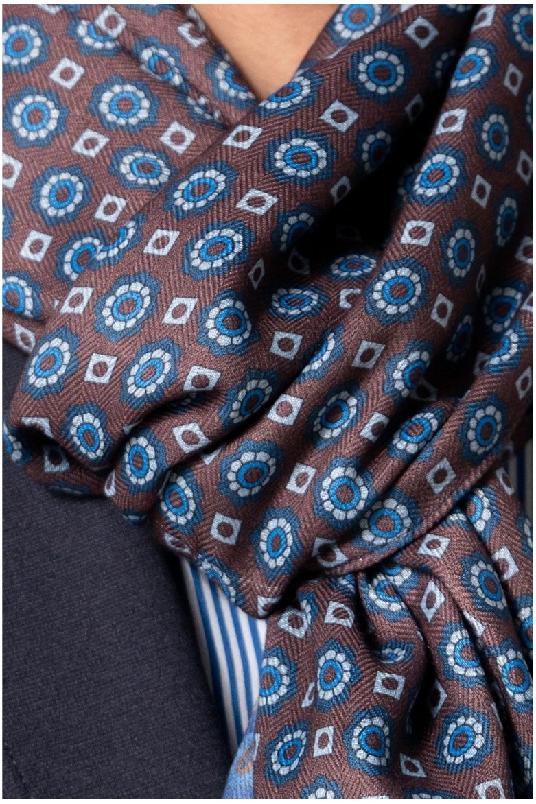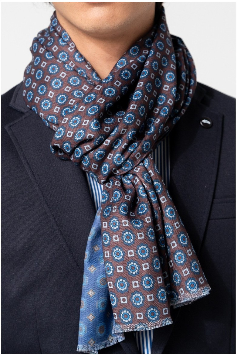 Fular de hombre en color azul con estampado geométrico multicolor, confeccionado en poliéster ligero y suave al tacto que aporta confort y estilo. Fabricado en España.