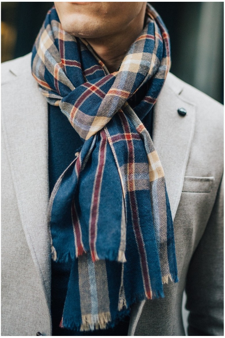 Fular de hombre en color azul con diseño de cuadros en tonos combinados, confeccionado en lana 100% que aporta calidez, suavidad y un estilo atemporal. Fabricado en España.