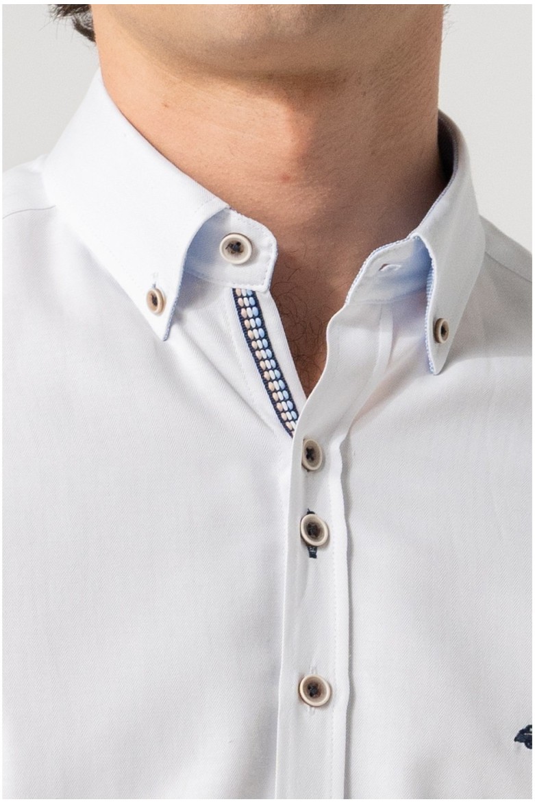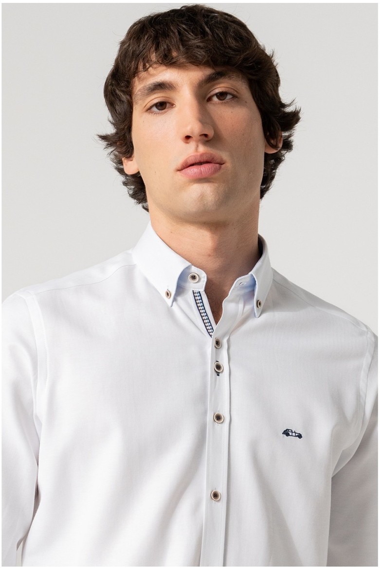 Camisa de hombre en tejido liso de 56% algodón y 44% poliéster, de corte slim fit con manga larga y cuello con botones, que combina confort, durabilidad y un estilo versátil. Confeccionada en España de manera sostenible.
