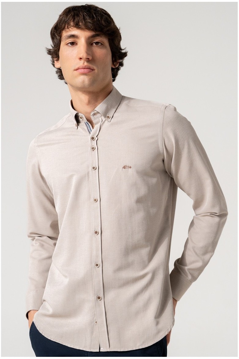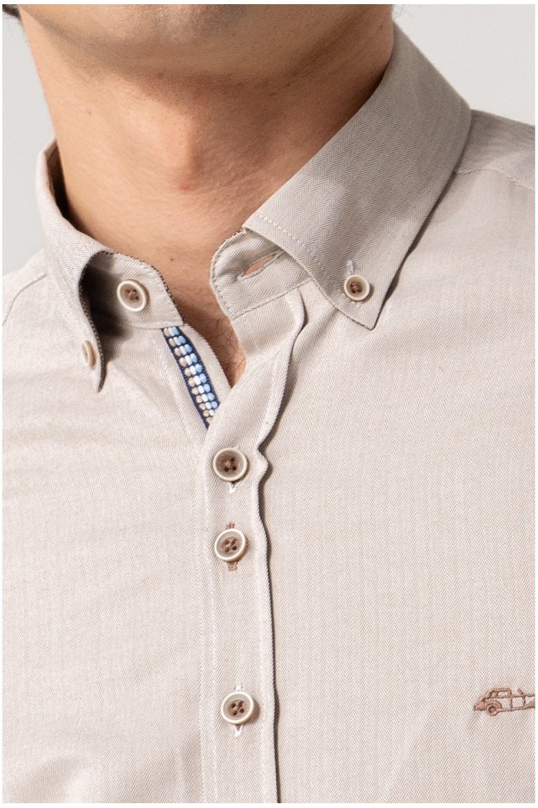 Camisa slim fit de hombre en color beige liso, con manga larga y cuello con botones, diseñada para un estilo actual y versátil. Fabricada en España.