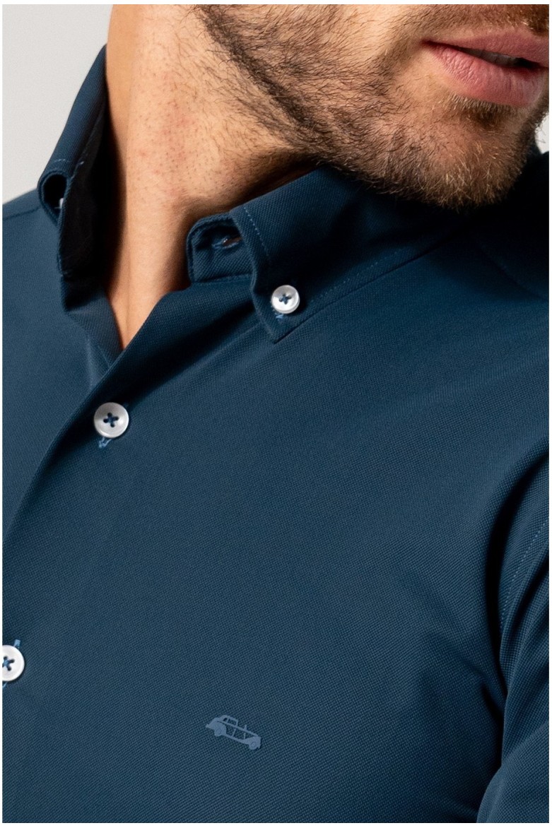 Camisa de hombre regular fit en color azul liso, con manga larga y cuello con botones, confeccionada en tejido técnico elástico que aporta comodidad, frescura y facilidad de movimiento. Confeccionada en España.