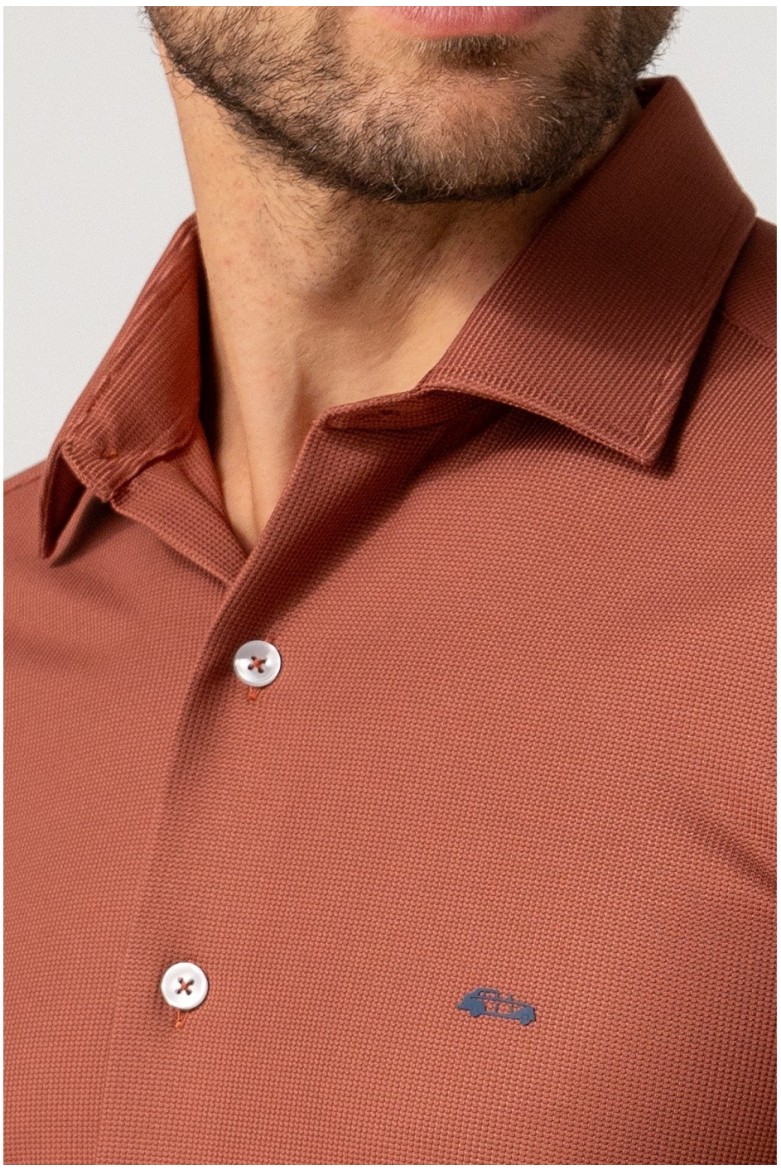Camisa regular fit en color caldera con cuello italiano, manga larga y ligero efecto de microestampado en el tejido, confeccionada en material elástico que ofrece confort y libertad de movimiento. Fabricada en España.