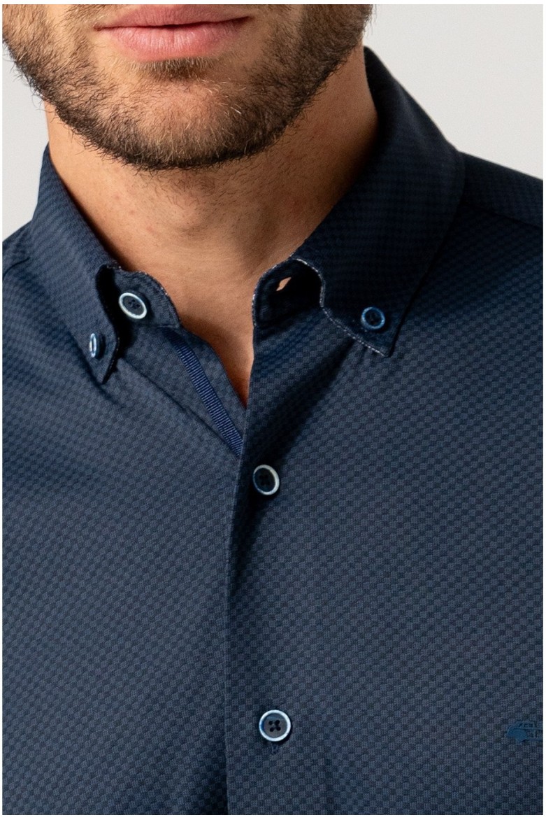 Camisa de hombre regular fit en color marino con cuello de botones y manga larga, confeccionada en tejido elástico con microtextura que aporta comodidad, frescura y libertad de movimiento. Hecha en España.